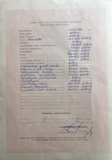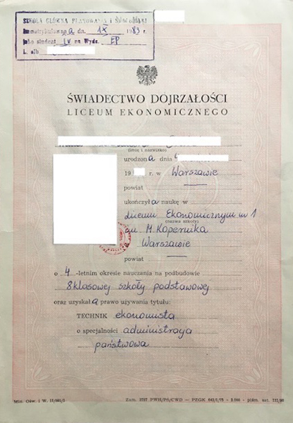 „Świadectwo dojrzałości liceum ekonomicznego (PRL, 1982 r.)“ – Musterübersetzung aus dem Polnischen ins Deutsche