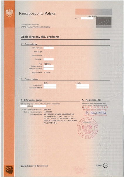 Odpis skrócony aktu urodzenia (4 pkt.)