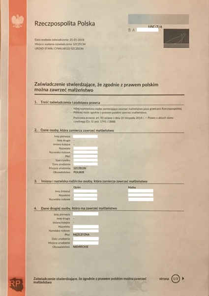 „Zaświadczenie stwierdzające, że zgodnie z prawem polskim można zawrzeć małżeństwo“ – Musterübersetzung aus dem Polnischen ins Deutsche